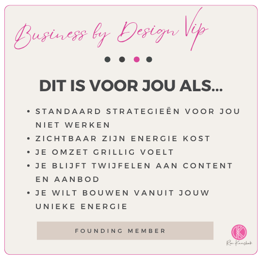Als jij voelt dat het tijd is om te stoppen met jezelf aanpassen aan strategieën die niet bij je passen, dan ben je meer dan welkom in Business by Design VIP.