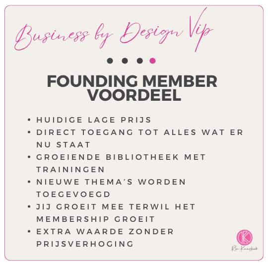 Het mooie is: jij groeit niet pas later in, maar bouwt vanaf de start mee aan de fundering van deze membership. Daardoor voelt alles meteen logisch, overzichtelijk en toepasbaar op jouw business.